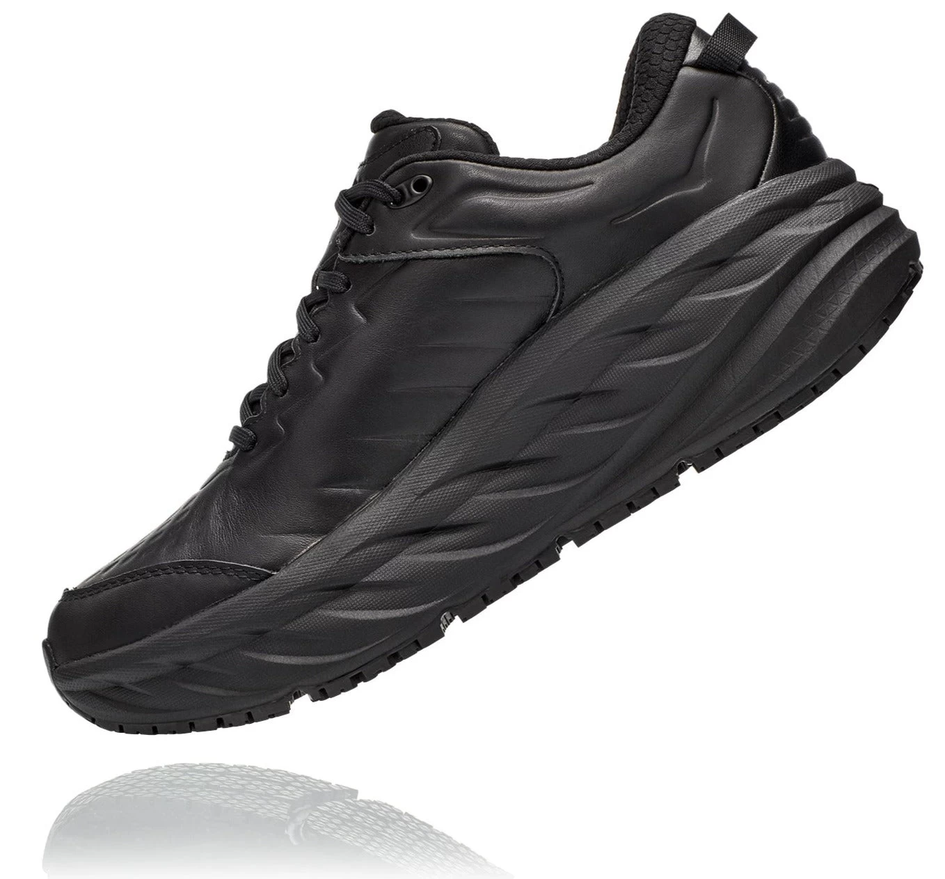 One of the first line extensions of the beloved Bondi family, the new Bondi SR takes the most cushioned shoe in the HOKA road-shoe lineup and reworks the silhouette to handle the demands of daily life. Engineered with an EVA midsole for plush, all-day cushioning, this workplace warrior has been updated with water-resistant leather and a slip-resistant outsole. Boasting a proprietary outsole compound tested against industry standards, the Bondi SR features an ultra-grippy, full ground contact rubber that stands up to the service industry and medial field alike.